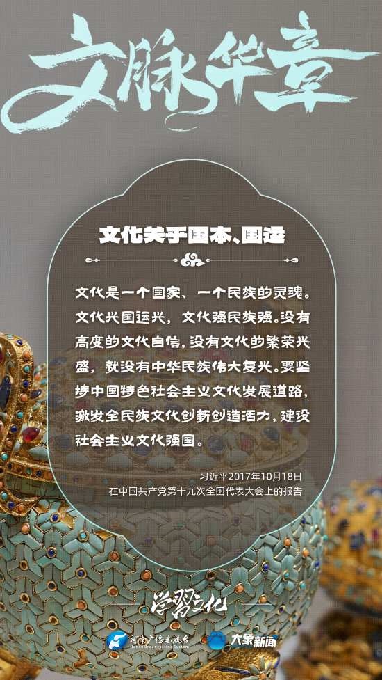 習(xí)近平總書記高度重視文化之于國家、之于民族的重大意義,強調(diào):文化是一個國家、一個民族的靈魂。文化興國運興,文化強民族強。沒有高度的文化自信,沒有文化的繁榮興盛,就沒有中華民族偉大復(fù)興。大象新聞梳理了習(xí)近平總書記的系列重要論述,我們一起學(xué)習(xí)。