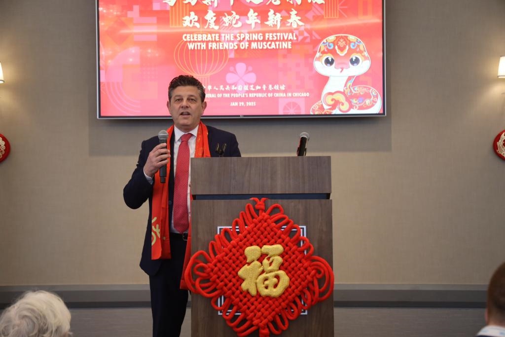 當(dāng)?shù)貢r(shí)間1月29日,在馬斯卡廷,艾奧瓦州友好委員會(huì)董事會(huì)成員盧卡·貝隆與中美學(xué)生歡度蛇年新春。新華社記者徐劍梅攝