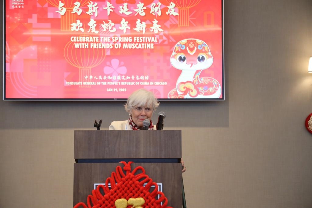 美國(guó)艾奧瓦州小城馬斯卡廷,當(dāng)?shù)貢r(shí)間農(nóng)歷蛇年初一。明媚陽(yáng)光照耀下,在梅里爾酒店六層,一場(chǎng)特別的新春聚會(huì)正在舉行。福字、窗花、中國(guó)結(jié),“中國(guó)紅”裝點(diǎn)著喜慶祥和的氛圍。中美友人歡聚一堂,沉浸在歡聲笑語(yǔ)中。