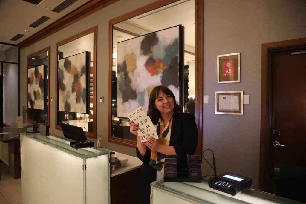 “請(qǐng)您稍等”“請(qǐng)聯(lián)系我”……在中國(guó)學(xué)生們?nèi)胱〉木频?,前臺(tái)工作人員謝伊·馬丁提前準(zhǔn)備了厚厚一疊中文指引卡片,讓很多第一次海外過(guò)年的中國(guó)小客人感到心里暖暖的。