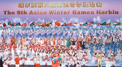 二月七日,第九屆亞洲冬季運(yùn)動(dòng)會(huì)開幕式在黑龍江省哈爾濱市舉行。圖為演員在開幕式上表演。