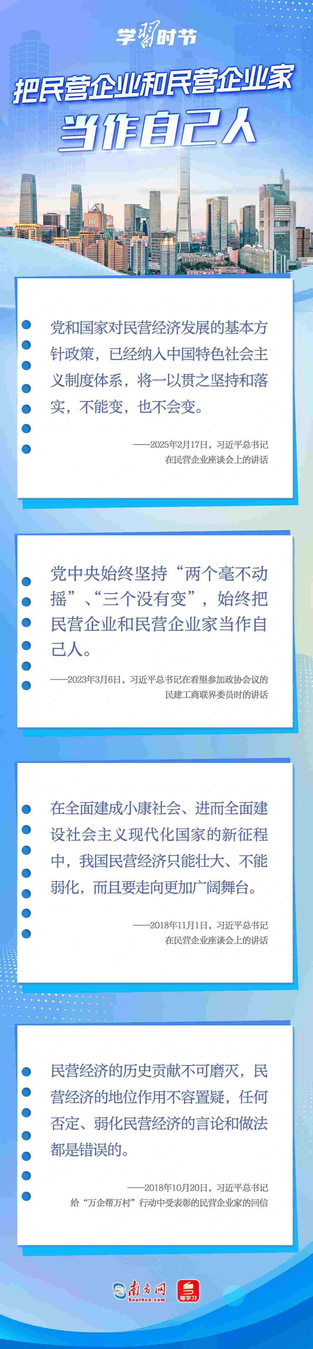 2月17日,習(xí)近平總書(shū)記在出席民營(yíng)企業(yè)座談會(huì)時(shí)強(qiáng)調(diào),黨和國(guó)家對(duì)民營(yíng)經(jīng)濟(jì)發(fā)展的基本方針政策,已經(jīng)納入中國(guó)特色社會(huì)主義制度體系,將一以貫之堅(jiān)持和落實(shí),不能變,也不會(huì)變。