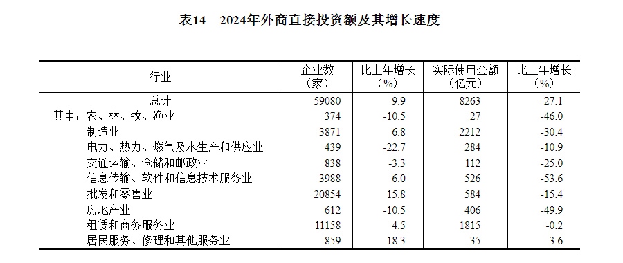 全年新設外商投資企業(yè)59080家,比上年增長9.9%。實際使用外資8263億元,下降27.1%,折1162億美元,下降28.8%。其中,共建“一帶一路”國家(含通過部分自由港對華投資)對華新設外商投資企業(yè)17172家,增長23.8%;對華直接投資1147億元,下降6.2%,折161億美元,下降8.4%。高技術產業(yè)實際使用外資2864億元,下降32.3%,折403億美元,下降34.0%。