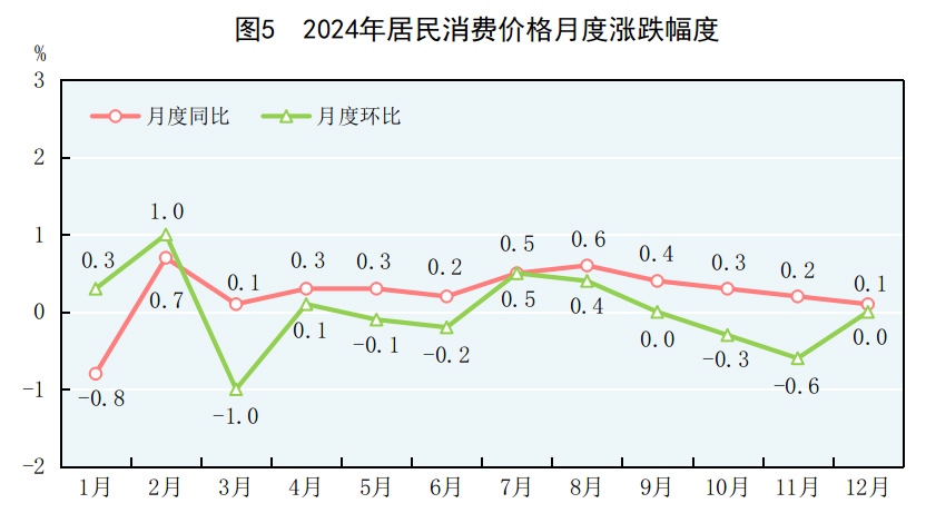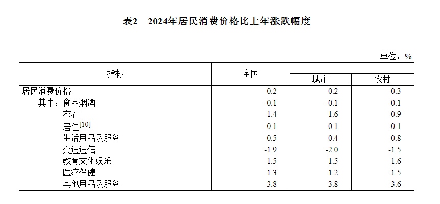 全年居民消費價格比上年上漲0.2%。工業(yè)生產者出廠價格下降2.2%。工業(yè)生產者購進價格下降2.2%。農產品生產者價格[9]下降0.9%。12月份,70個大中城市中,新建商品住宅銷售價格環(huán)比上漲的城市個數(shù)為23個,持平的為4個,下降的為43個;二手住宅銷售價格環(huán)比上漲的城市個數(shù)為9個,持平的為1個,下降的為60個;新建商品住宅銷售價格同比上漲的城市個數(shù)為2個,下降的為68個;二手住宅銷售價格同比下降的城市個數(shù)為70個。