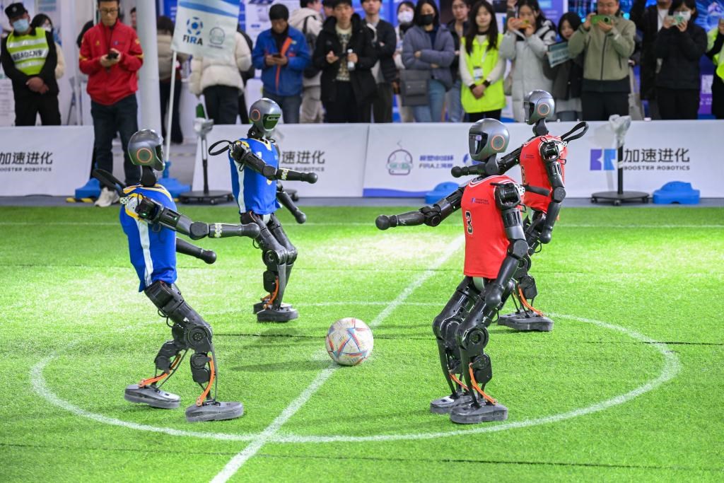 2月21日,機(jī)器人在2025全球開(kāi)發(fā)者先鋒大會(huì)現(xiàn)場(chǎng)踢足球。 新華社發(fā)(陳浩明 攝)