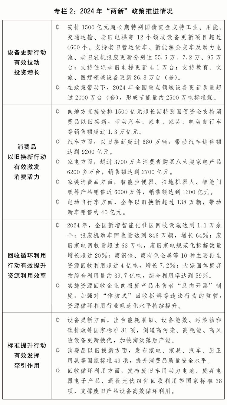 三是大規(guī)模設(shè)備更新和消費(fèi)品以舊換新政策落地見(jiàn)效。印發(fā)“兩新”行動(dòng)方案,出臺(tái)工業(yè)、建筑市政、交通、農(nóng)業(yè)、教育、文旅、醫(yī)療等七大領(lǐng)域設(shè)備更新實(shí)施方案和消費(fèi)品以舊換新、回收循環(huán)利用、標(biāo)準(zhǔn)提升引領(lǐng)行動(dòng)方案。安排3000億元超長(zhǎng)期特別國(guó)債加力支持“兩新”工作。2024年,“兩新”政策帶動(dòng)全國(guó)設(shè)備工器具購(gòu)置投資增長(zhǎng)15.7%,高于固定資產(chǎn)投資(不含農(nóng)戶)增速12.5個(gè)百分點(diǎn);限額以上單位家用電器和音像器材類、家具類商品零售額分別增長(zhǎng)12.3%、3.6%,帶動(dòng)大宗耐用消費(fèi)品銷售額超過(guò)1.3萬(wàn)億元;消費(fèi)品以舊換新活動(dòng)中,新能源汽車銷量占比超過(guò)60%,一級(jí)能效家電銷售額占比超過(guò)90%。