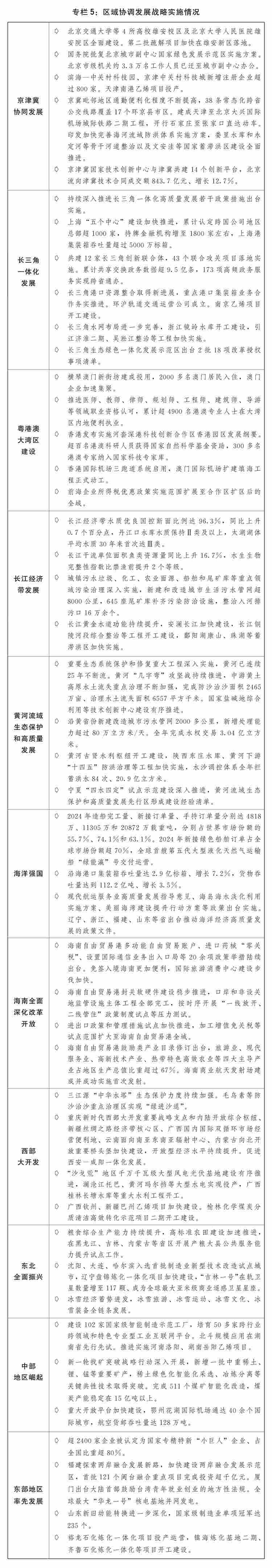 一是區(qū)域協(xié)調(diào)發(fā)展積厚成勢(shì)。京津冀協(xié)同發(fā)展走深走實(shí),在京相關(guān)高校、醫(yī)院、中央企業(yè)總部及二三級(jí)子公司分批向雄安新區(qū)疏解,北京城市副中心行政辦公、商務(wù)服務(wù)、文化旅游等功能不斷完善,進(jìn)一步支持天津?yàn)I海新區(qū)高質(zhì)量發(fā)展若干政策措施出臺(tái)實(shí)施,三省市互聯(lián)互通交通網(wǎng)絡(luò)更加完善、產(chǎn)業(yè)鏈上下游協(xié)作持續(xù)強(qiáng)化、公共服務(wù)共建共享水平進(jìn)一步提升。長(zhǎng)三角一體化高質(zhì)量發(fā)展深入推進(jìn),生態(tài)綠色一體化發(fā)展示范區(qū)改革授權(quán)壓茬推進(jìn),港口資源整合、軌道互聯(lián)互通等取得新進(jìn)展,上?!拔鍌€(gè)中心”建設(shè)進(jìn)一步加快?;浉郯拇鬄硡^(qū)建設(shè)邁上新臺(tái)階,橫琴粵澳深度合作區(qū)封關(guān)“一線”“二線”分線管理運(yùn)行順利,超1.6萬(wàn)名澳門居民在合作區(qū)居住生活,支持河套深港科技創(chuàng)新合作區(qū)深圳園區(qū)、香港園區(qū)聯(lián)動(dòng)發(fā)展,創(chuàng)新要素跨境流動(dòng)更加便捷。長(zhǎng)江經(jīng)濟(jì)帶共抓大保護(hù)、不搞大開(kāi)發(fā)成效顯著,進(jìn)一步抓實(shí)抓好長(zhǎng)江大保護(hù)工作三年行動(dòng)計(jì)劃出臺(tái)實(shí)施,長(zhǎng)江十年禁漁取得明顯成效,長(zhǎng)江干流連續(xù)5年保持Ⅱ類水質(zhì),綜合立體交通走廊加快構(gòu)建,沿江高鐵全線開(kāi)工建設(shè)。黃河流域生態(tài)保護(hù)和高質(zhì)量發(fā)展邁出堅(jiān)實(shí)步伐,農(nóng)業(yè)面源、城鎮(zhèn)生活、工業(yè)和尾礦庫(kù)污染治理深入推進(jìn),8萬(wàn)余個(gè)入河排污口開(kāi)展溯源整治,一批生態(tài)保護(hù)修復(fù)重點(diǎn)項(xiàng)目加快建設(shè),黃河干流連續(xù)3年保持Ⅱ類水質(zhì)。海洋強(qiáng)國(guó)建設(shè)深入推進(jìn),海洋強(qiáng)省、現(xiàn)代海洋城市、全國(guó)海洋經(jīng)濟(jì)發(fā)展示范區(qū)創(chuàng)新發(fā)展,海洋生態(tài)環(huán)境質(zhì)量持續(xù)改善,海洋生產(chǎn)總值超10萬(wàn)億元。