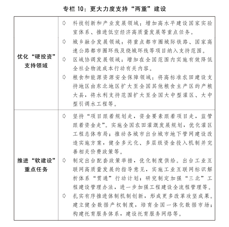 三是加力推進(jìn)“兩重”建設(shè)。進(jìn)一步完善自上而下的工作機(jī)制,加強(qiáng)“兩重”建設(shè)項(xiàng)目?jī)?chǔ)備,更好統(tǒng)籌“硬投資”與“軟建設(shè)”。安排超長(zhǎng)期特別國(guó)債8000億元支持“兩重”建設(shè),進(jìn)一步優(yōu)化具體投向并提高項(xiàng)目支持比例,重點(diǎn)支持基礎(chǔ)研究能力提升、未來(lái)產(chǎn)業(yè)發(fā)展、東北等重點(diǎn)地區(qū)高標(biāo)準(zhǔn)農(nóng)田建設(shè)、大中型灌區(qū)新建改造及大中型引調(diào)水和大中型水庫(kù)建設(shè)、長(zhǎng)江經(jīng)濟(jì)帶生態(tài)環(huán)境保護(hù)和綠色發(fā)展、農(nóng)業(yè)轉(zhuǎn)移人口市民化公共服務(wù)體系建設(shè)、高等教育提質(zhì)升級(jí)、城市地下管網(wǎng)管廊建設(shè)改造等方面任務(wù),強(qiáng)化超長(zhǎng)期貸款等配套融資,高質(zhì)量推進(jìn)“硬投資”項(xiàng)目謀劃實(shí)施。加大力度推動(dòng)“軟建設(shè)”政策落地見(jiàn)效。