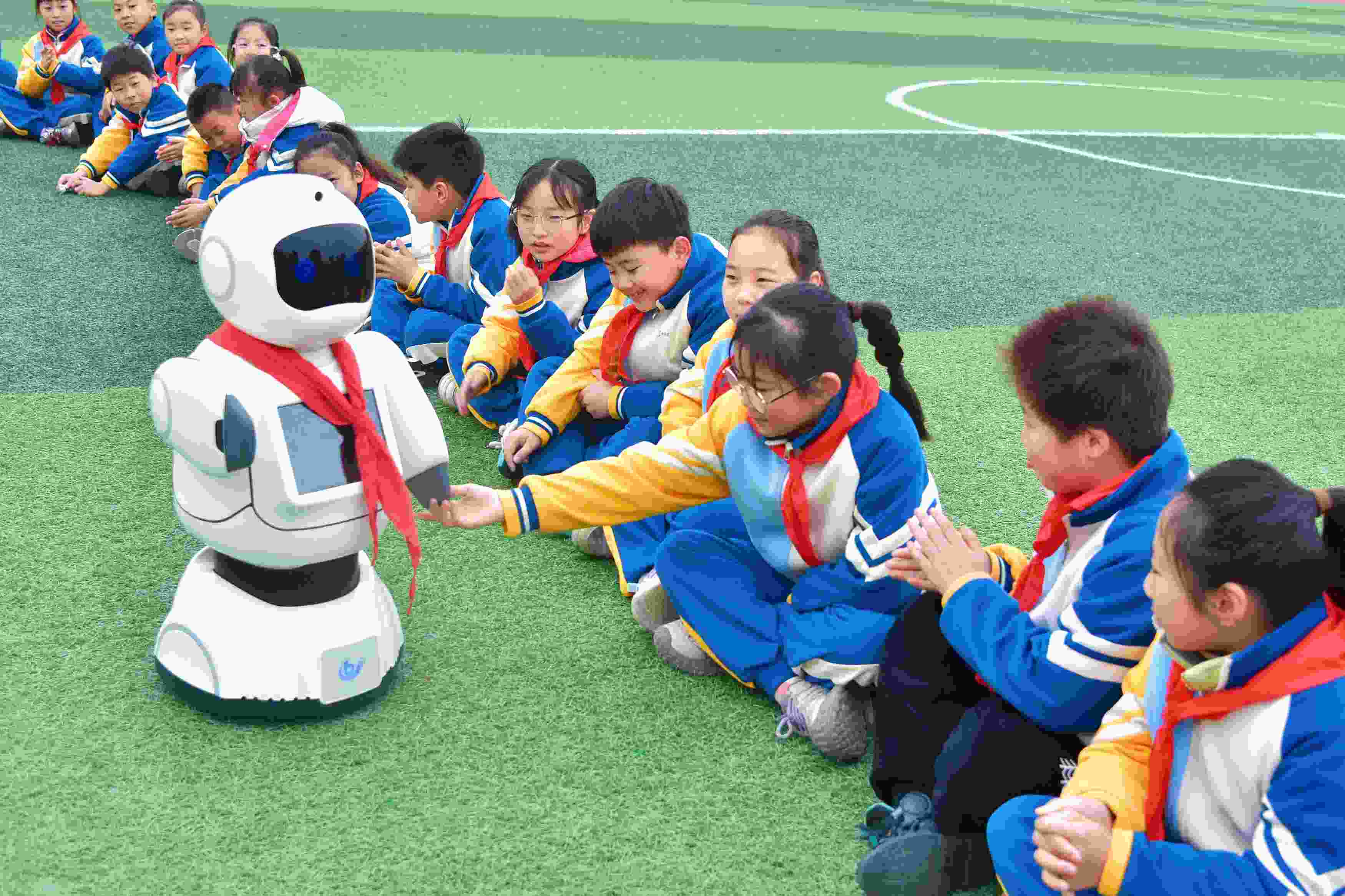 △2025年3月10日,江蘇南通,如皋經(jīng)濟技術(shù)開發(fā)區(qū)實驗小學課間,學生與智能機器人“賓果”互動。