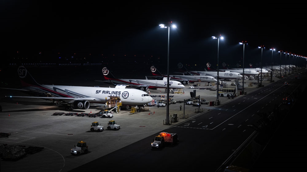 2024年5月25日凌晨,工人在湖北鄂州花湖國(guó)際機(jī)場(chǎng)停機(jī)坪裝卸貨物。鄂州花湖國(guó)際機(jī)場(chǎng)于2022年7月建成投運(yùn),是亞洲首個(gè)專業(yè)貨運(yùn)樞紐機(jī)場(chǎng)。截至2025年1月26日,鄂州花湖國(guó)際機(jī)場(chǎng)已開(kāi)通37條國(guó)際貨運(yùn)航線和66條國(guó)內(nèi)貨運(yùn)航線。