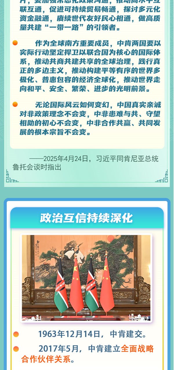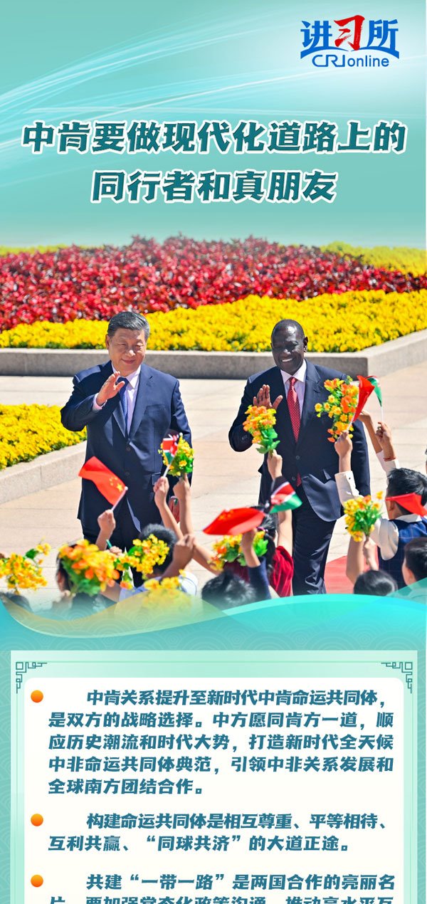 4月24日,中國(guó)國(guó)家主席習(xí)近平同肯尼亞總統(tǒng)魯托在北京舉行會(huì)談,兩國(guó)元首一致同意將雙邊關(guān)系定位提升至新時(shí)代中肯命運(yùn)共同體。習(xí)近平表示,構(gòu)建命運(yùn)共同體是相互尊重、平等相待、互利共贏、“同球共濟(jì)”的大道正途。中肯雙方要做現(xiàn)代化道路上的同行者和真朋友。