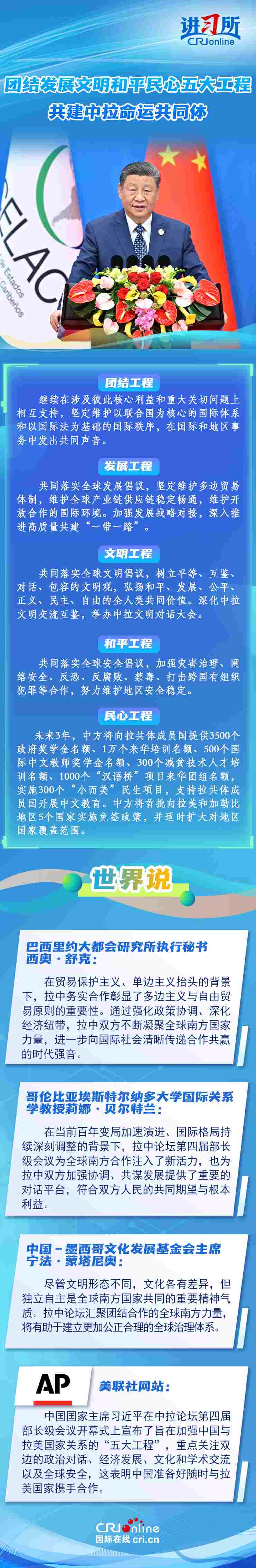 5月13日,中國國家主席習(xí)近平出席中拉論壇第四屆部長級會議開幕式并發(fā)表主旨講話。習(xí)近平宣布,中方愿同拉方攜手啟動五大工程,共謀發(fā)展振興,共建中拉命運(yùn)共同體。他強(qiáng)調(diào),無論國際風(fēng)云如何變化,中國始終做拉美和加勒比國家的好朋友、好伙伴。