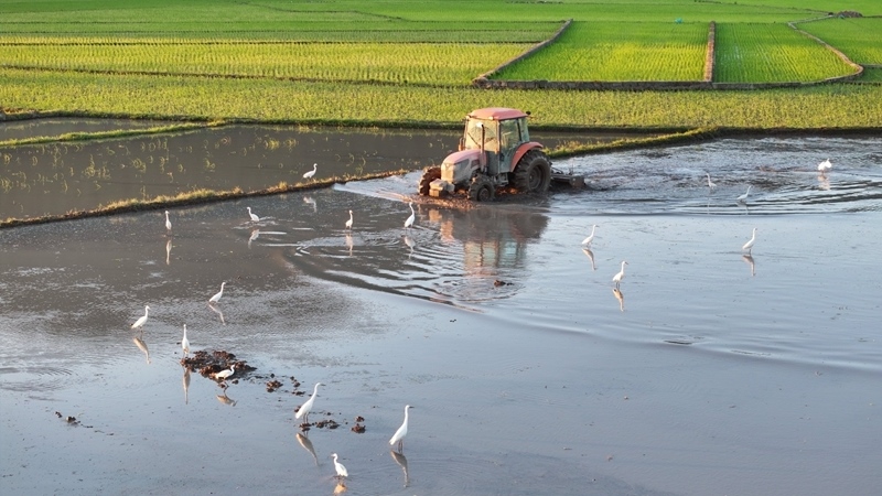 6月10日,在云南省騰沖市和順古鎮(zhèn),農(nóng)民駕駛農(nóng)機翻耕農(nóng)田準備栽插水稻秧苗,引來成群的白鷺覓食、嬉戲(無人機照片)。