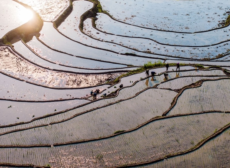 6月11日,湖北省秭歸縣沙鎮(zhèn)溪鎮(zhèn)長春村村民在水田里插秧(無人機照片)。