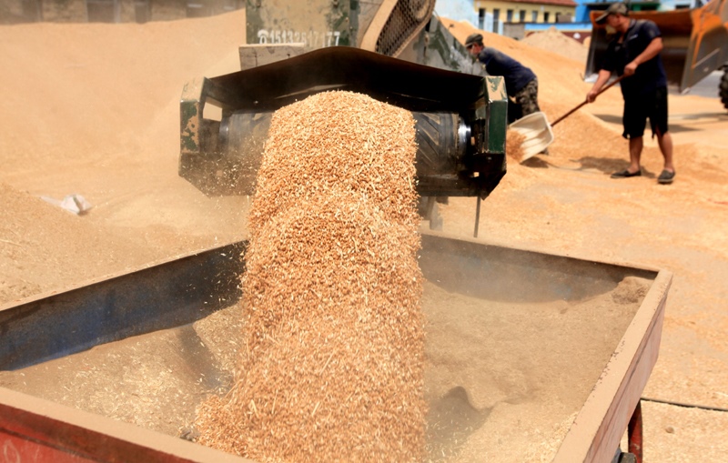 6月13日,河南省焦作市溫縣一家糧庫職工往倉庫儲運夏糧。