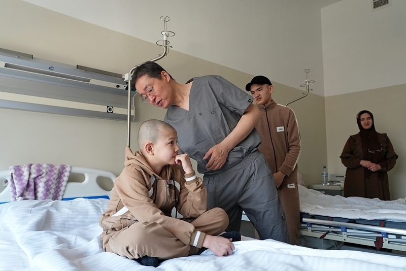 2025年2月20日,在位于烏茲別克斯坦塔什干的共和國(guó)耳鼻喉科及頭頸疾病專業(yè)科學(xué)實(shí)踐醫(yī)療中心,劉玉和醫(yī)生(左二) 在術(shù)前查看患兒情況。新華社發(fā)(扎法爾?攝)
