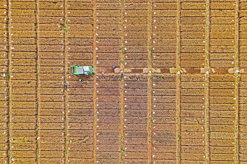 6月18日,收割機在山東省煙臺市一處試驗田里收割小麥(無人機照片)。