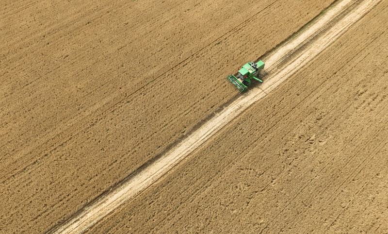 6月18日,河北石家莊晉州市周家莊鄉(xiāng)北捏盤村農(nóng)戶駕駛聯(lián)合收割機收割小麥(無人機照片)。