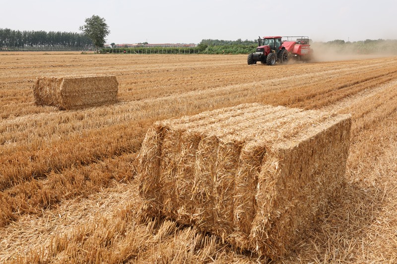 6月18日,在河北石家莊晉州市周家莊鄉(xiāng)北捏盤村麥田,農(nóng)戶駕駛秸稈打捆機作業(yè)。