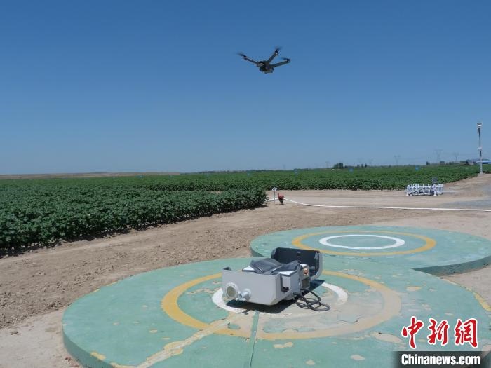 6月28日,新疆石河子市一片棉田中,遙感監(jiān)測(cè)作物長(zhǎng)勢(shì)的無(wú)人機(jī)巡檢返回。 趙婧姝 攝