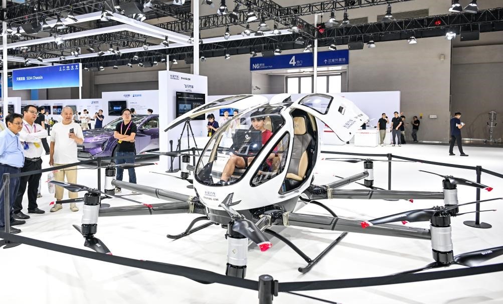 2025年9月5日,在重慶舉行的2025世界智能產(chǎn)業(yè)博覽會(huì)上,觀眾在長(zhǎng)安汽車(chē)展區(qū)參觀、體驗(yàn)“飛行汽車(chē)”。新華社記者王全超攝