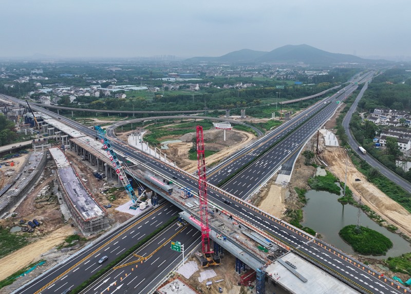 9月13日拍攝的滬武高速公路擴建工程江陰段上跨京滬高速公路鋼箱梁架設施工現(xiàn)場(無人機照片)。
