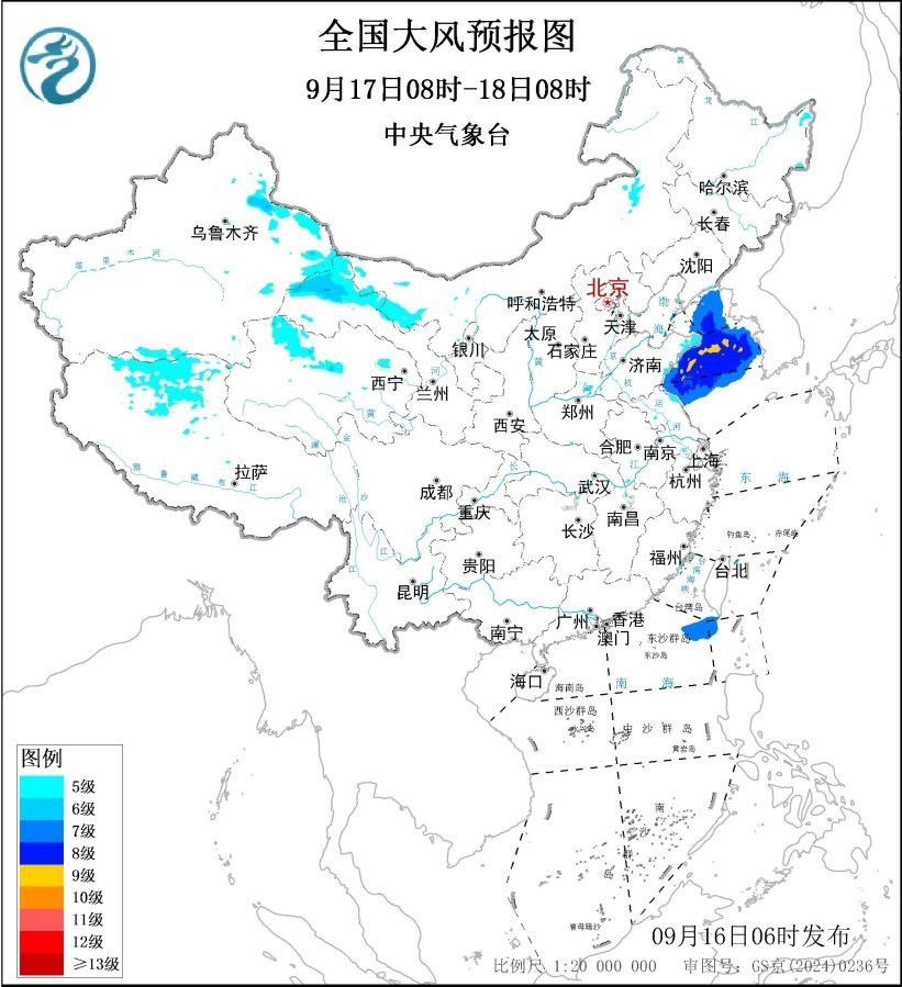 預(yù)計,9月16日8時至17日8時,新疆東部及南疆盆地、甘肅河西、青海北部、內(nèi)蒙古西部和中東部、東北地區(qū)西部、山東半島等地部分地區(qū)有5級、陣風(fēng)7級的大風(fēng),其中,內(nèi)蒙古東北部的部分地區(qū)風(fēng)力可達(dá)7級、陣風(fēng)9級;渤海、渤海海峽、黃海北部和中西部海域?qū)⒂?~8級、陣風(fēng)9級的大風(fēng),其中黃海中西部的部分海域風(fēng)力可達(dá)9~10級、陣風(fēng)11級。