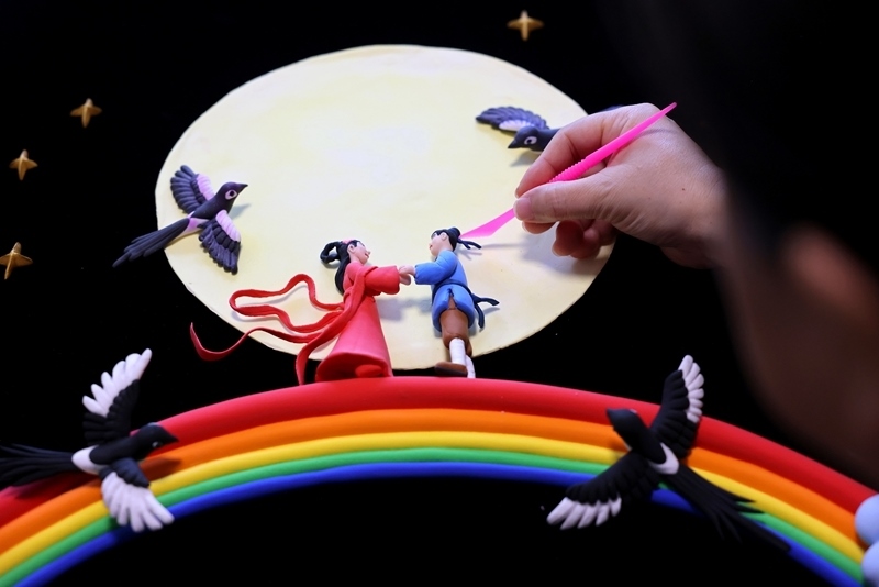 8月29日七夕節(jié),在山東省棗莊市非物質(zhì)文化遺產(chǎn)保護(hù)中心,民間藝人創(chuàng)作面塑作品《鵲橋會》。