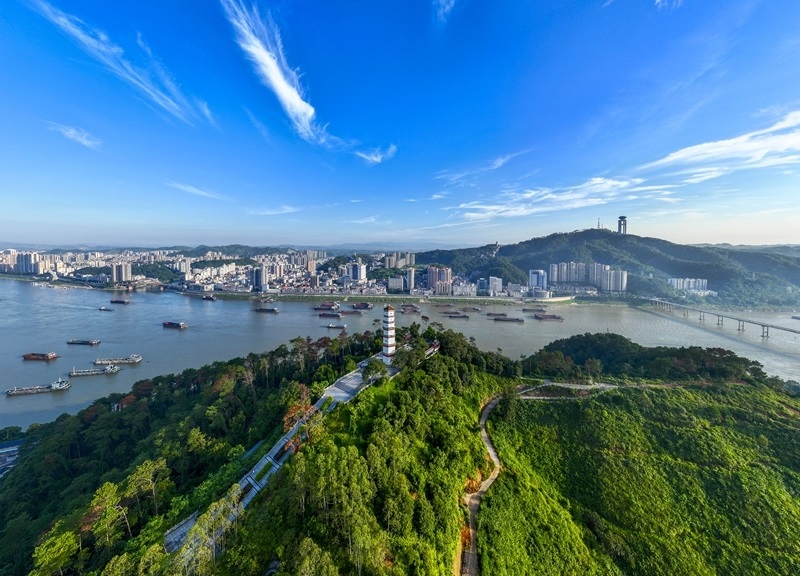 8月30日,在廣西梧州市萬秀區(qū)的西江航道上,船只在秋日晴空下往來穿梭(無人機(jī)照片)。