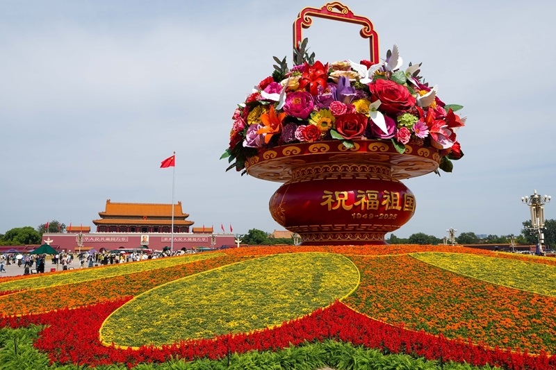 9月25日,2025年“祝福祖國”巨型花籃正式完工,亮相天安門廣場與市民共度佳節(jié)。今年“祝福祖國”花壇以喜慶的花籃為主景,花壇頂高18米,籃體高16米,籃盤直徑12米。籃體南側(cè)書寫“祝福祖國”“1949-2025”字樣,籃體北側(cè)書寫“歡度國慶”“1949-2025”字樣?;@內(nèi)選取了美好寓意的花卉,其中荷花寓意“和和美美”、橄欖枝寓意“榮耀和平”等,還結(jié)合和平鴿元素,體現(xiàn)“和平發(fā)展、欣欣向榮”。
