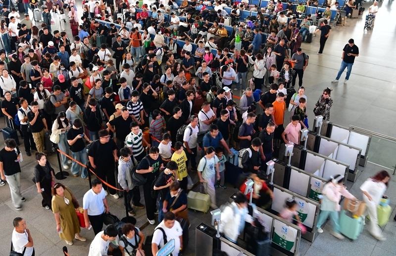 9月29日,旅客在江蘇無錫站候車大廳排隊(duì)檢票。