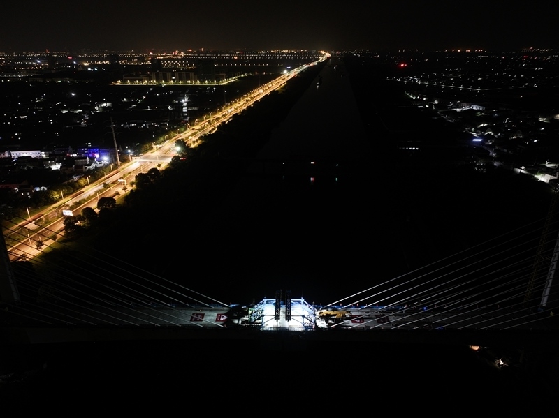 6月30日晚拍攝的滬渝蓉高鐵通泰揚(yáng)特大橋跨引江河斜拉橋施工現(xiàn)場(無人機(jī)照片)。