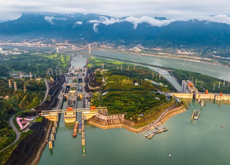 7月1日,在湖北宜昌,船舶有序通過三峽雙線五級船閘和升船機(jī)(無人機(jī)照片)。