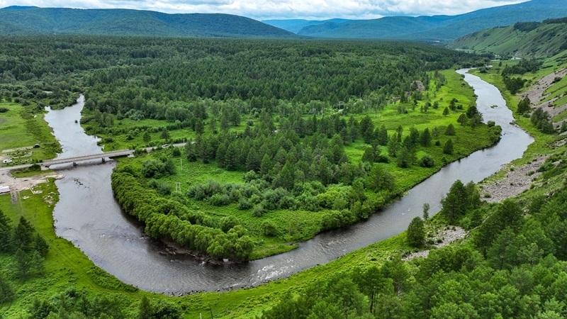 7月5日拍攝的流經(jīng)內(nèi)蒙古阿爾山國(guó)家森林公園的哈拉哈河(無(wú)人機(jī)照片)。