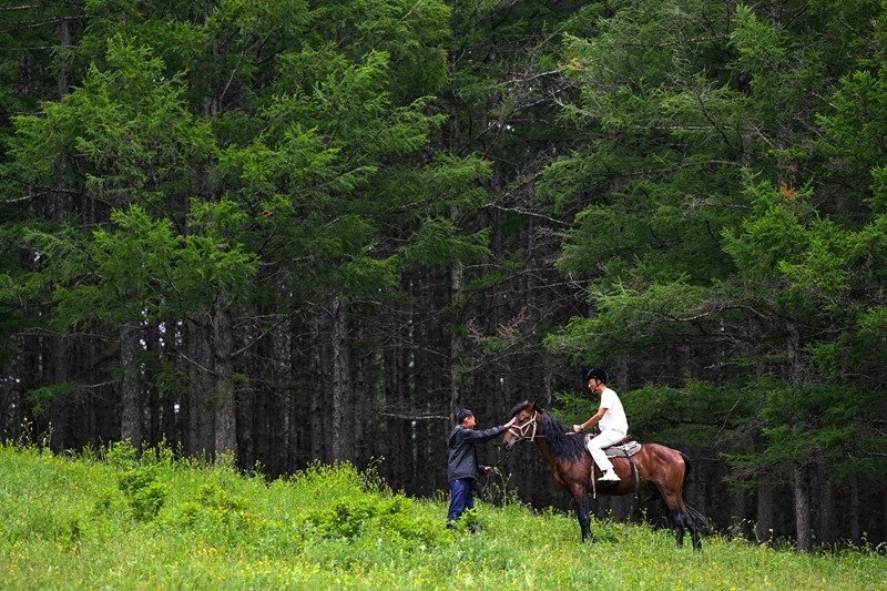 7月5日,游客在內(nèi)蒙古阿爾山國(guó)家森林公園體驗(yàn)騎馬。