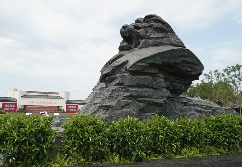 這是7月7日在中國人民抗日戰(zhàn)爭紀念館前拍攝的醒獅雕塑。