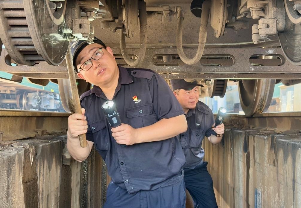 只見他俯下身鉆入車底,仔細(xì)檢查車輛的轉(zhuǎn)向架、制動(dòng)裝置等關(guān)鍵部位。車底空間狹小、光線不足,許立業(yè)需借助手電筒弓著腰作業(yè),不一會(huì)兒,汗水就浸濕了工作服。為了預(yù)防中暑,他掏出一瓶藿香正氣水,一口氣喝完,然后擦了擦臉上的汗水,繼續(xù)朝下節(jié)車廂走去。
