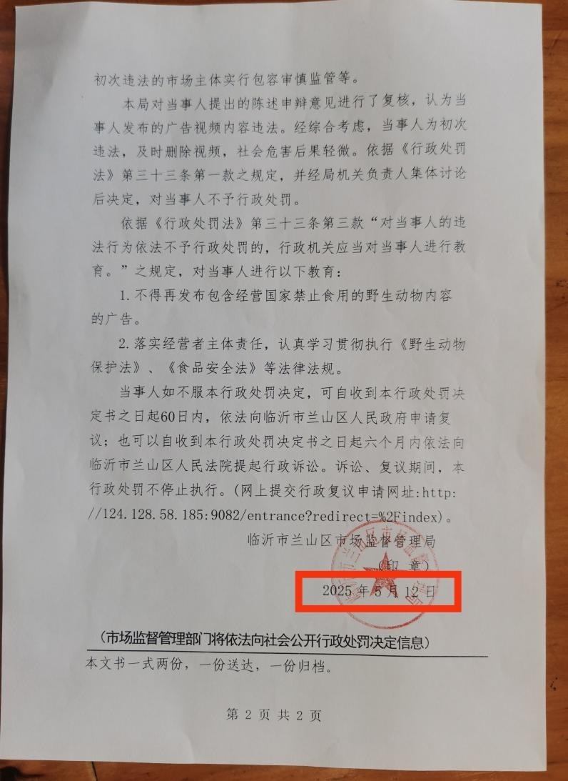 7月14日,山東臨沂“拍蛤蟆湯視頻被罰45萬(wàn)元”事件迎來(lái)最新進(jìn)展。代理此案的律師龔華告訴津云新聞?dòng)浾?,涉事飯館收到當(dāng)?shù)厥袌?chǎng)監(jiān)管局送達(dá)的《不予行政處罰決定書(shū)》,但落款時(shí)間卻為5月12日,其認(rèn)為本次送達(dá)的程序不合規(guī)。