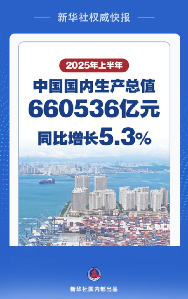 7月15日,國(guó)家統(tǒng)計(jì)局發(fā)布數(shù)據(jù)顯示,上半年,中國(guó)國(guó)內(nèi)生產(chǎn)總值(GDP)660536億元,按不變價(jià)格計(jì)算,同比增長(zhǎng)5.3%。