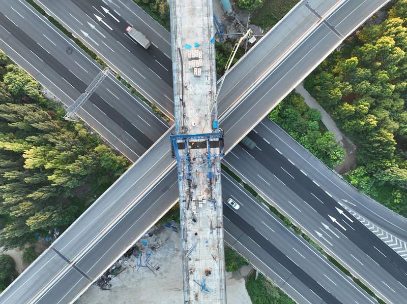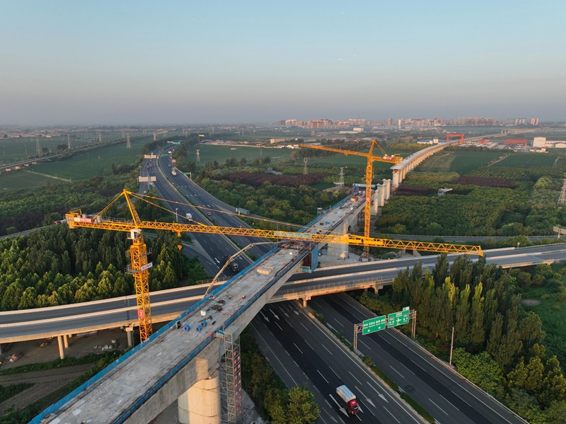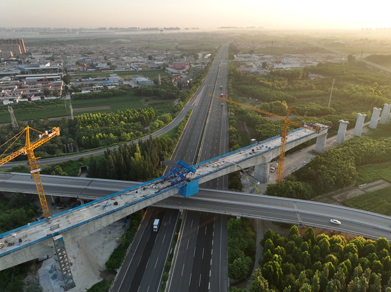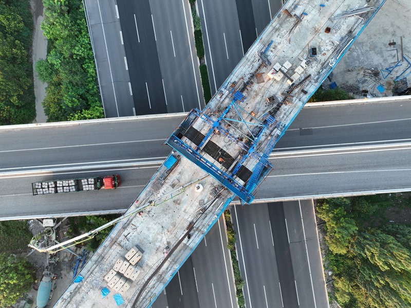7月18日拍攝的雄忻高鐵保定東特大橋跨京港澳高速連續(xù)梁中跨施工現(xiàn)場(無人機(jī)照片)。