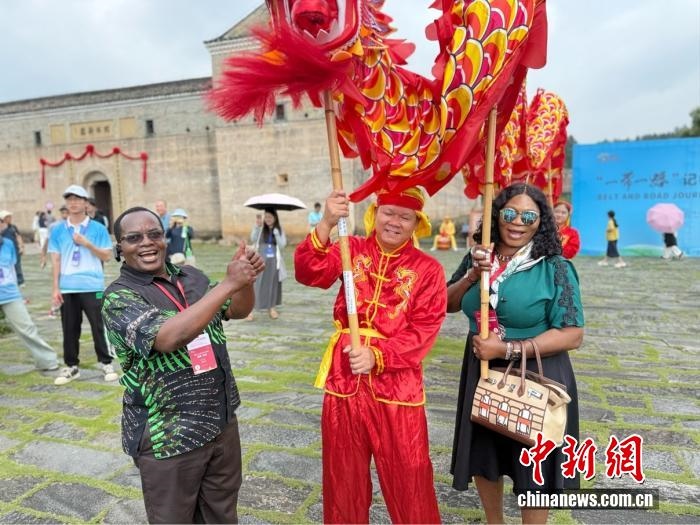 中新網(wǎng)7月21日電(記者 黃方) 鼓聲“咚咚咚”在江西贛州龍南市關(guān)西新圍響起,非洲記者大會(huì)秘書長威廉·奧洛首次嘗試舞龍。他興奮地?fù)u動(dòng)著龍頭,跟隨節(jié)奏躍動(dòng),忍不住連聲贊嘆:“這太有節(jié)奏感了!”