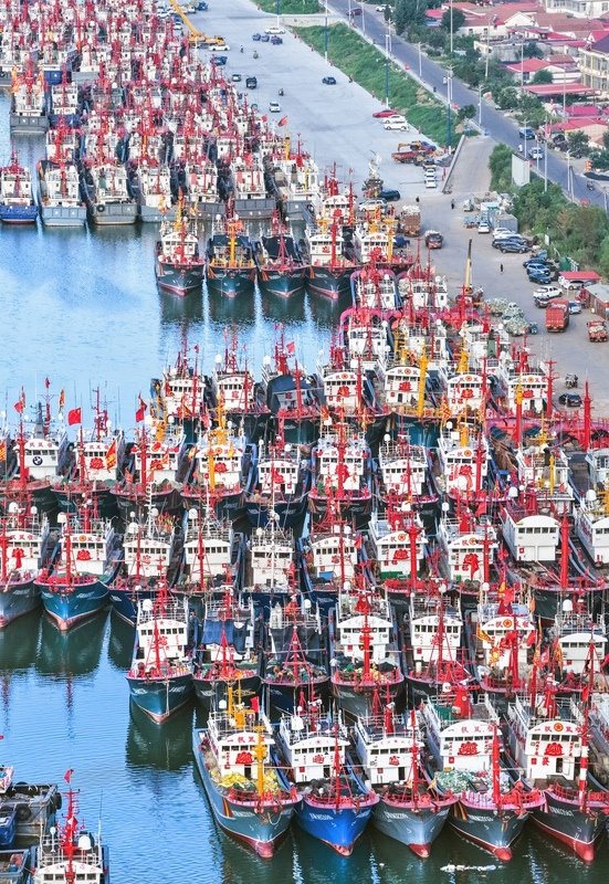 7月30日,漁船停泊在江蘇省連云港市贛榆區(qū)青口中心漁港,躲避臺(tái)風(fēng)(無人機(jī)照片)。
