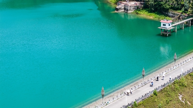 7月30日,游客在瑤池公園棧道上漫步(無(wú)人機(jī)照片)。