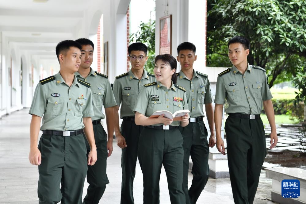 國(guó)防科技大學(xué)軍政基礎(chǔ)教育學(xué)院教授傅婉娟(左三)在課后與學(xué)員討論問(wèn)題(7月22日攝)。新華社發(fā)(王驍 攝)