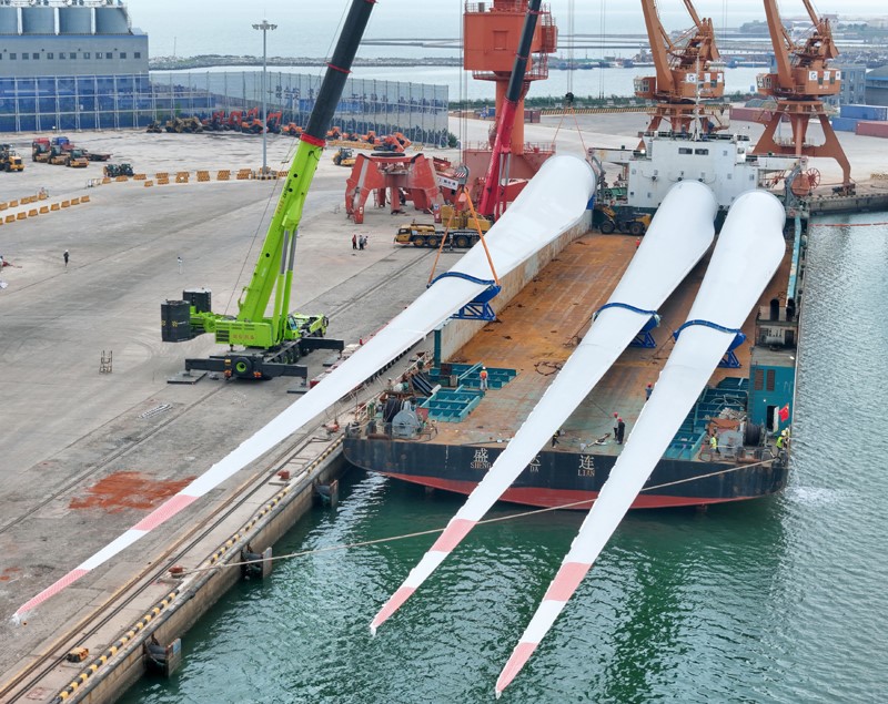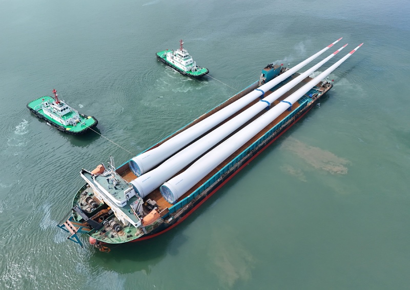 8月1日,三支超大尺寸海上風(fēng)力發(fā)電機(jī)試驗(yàn)葉片在山東港口煙臺(tái)港蓬萊港區(qū)完成裝船并運(yùn)往試驗(yàn)基地。該型葉片長達(dá)153米,重83.5噸,屬于150米級(jí)超大尺寸海上風(fēng)電葉片,現(xiàn)已完成全部靜力測(cè)試,即將在試驗(yàn)基地進(jìn)行疲勞測(cè)試驗(yàn)證。