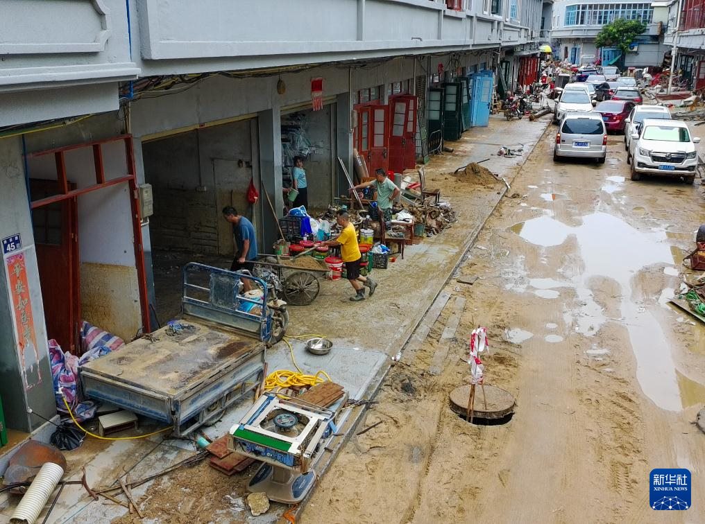 8月6日,工作人員在廣東肇慶鼎湖區(qū)鼎湖山風(fēng)景區(qū)門(mén)口清淤(無(wú)人機(jī)照片)。