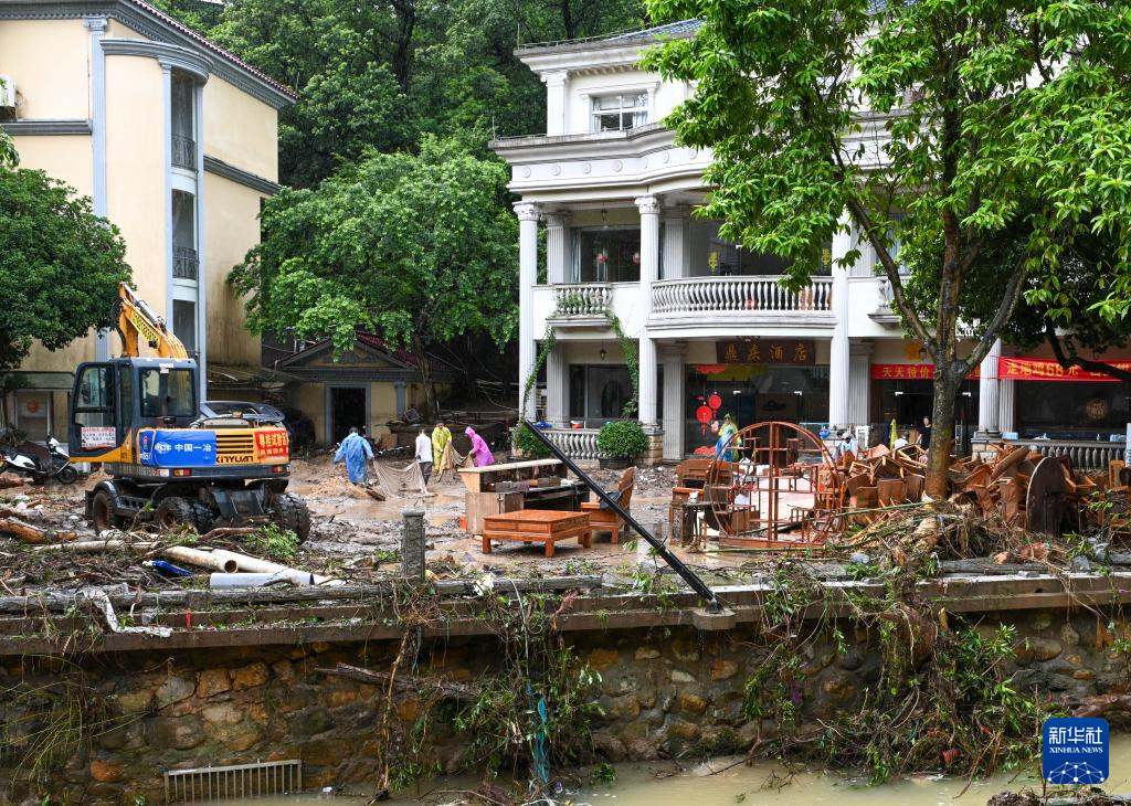 8月6日,工作人員在廣東肇慶鼎湖區(qū)鼎湖山風(fēng)景區(qū)門(mén)口清淤。