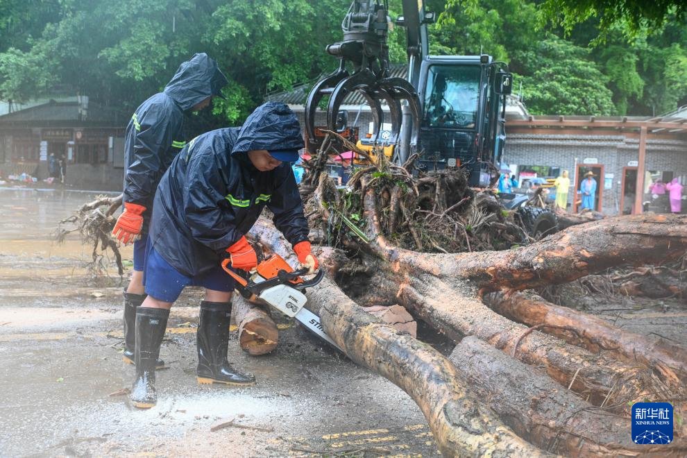 8月6日,工作人員在廣東肇慶鼎湖區(qū)鼎湖山風(fēng)景區(qū)門(mén)口用電鋸切割被沖倒的樹(shù)木。