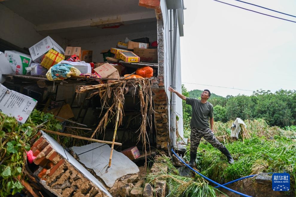 8月6日,廣東清遠(yuǎn)佛岡縣石角鎮(zhèn)黃花村黨委書(shū)記李庚原在一棟被沖毀的房屋旁了解房屋受損情況。