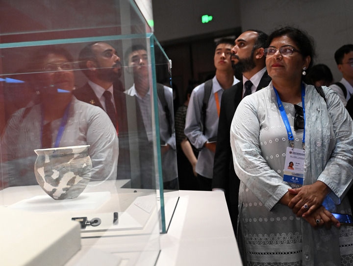 2025年7月24日,上海合作組織媒體智庫峰會(huì)子活動(dòng)“文化遺產(chǎn)保護(hù)利用交流合作會(huì)”的參會(huì)嘉賓在鄭州大河村遺址博物館新館參觀。新華社記者 李嘉南 攝